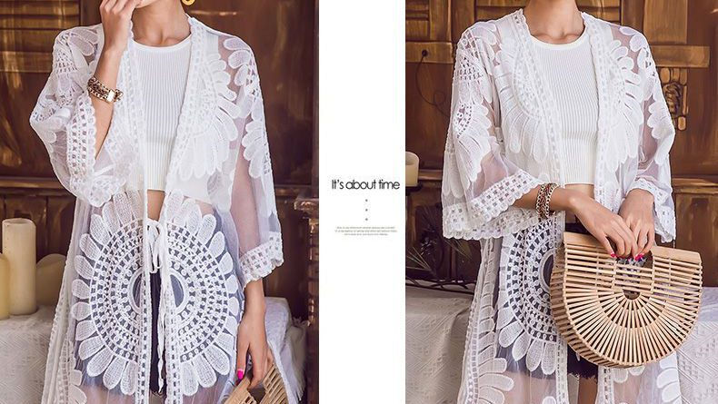 สวยเก๋สไตล์สาวเกาหลีผสมสานความเป็นสาววินเทจด้วยเสื้อคลุมตัวยาว สวยหวานด้วยเนื้อผ้าลูกไม้ทอลายเป็นลาย มิกซ์แอนด์แมตซ์ได้หลายลุคหลายสไตล์เลยนะคะ ใส่คลุมกับเสื้อกล้ามแมตซ์กับกางเกงยีนส์เหมือนนางแบบก็ดูสวยเก๋มากคะ หรือใส่คลุมบีกี่นี่เวลาสาวๆ ไปเที่ยวที่ทะเลก็ดูสวยมากคะ เนื้อผ้าสวยอย่างดี เนื้อผ้านุ่มมากคะ Cutting ลายผ้าสวยมากคะ